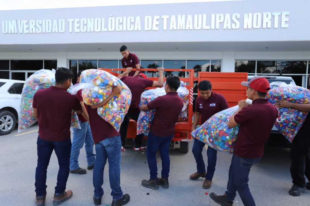 Reynosa, Tamaulipas. – Con el firme propósito de contribuir al bienestar de quienes más lo necesitan, acorde a la visión humanista del gobernador Américo Villarreal Anaya, alumnas y alumnos de la Universidad Tecnológica de Tamaulipas Norte, se sumaron a la lucha contra el cáncer, mediante la colecta y entrega de 160 mil taparroscas a Voluntad Contra el Cáncer A.C., organización cuyo objeto es apoyar a niñas y niños con cáncer de escasos recursos.